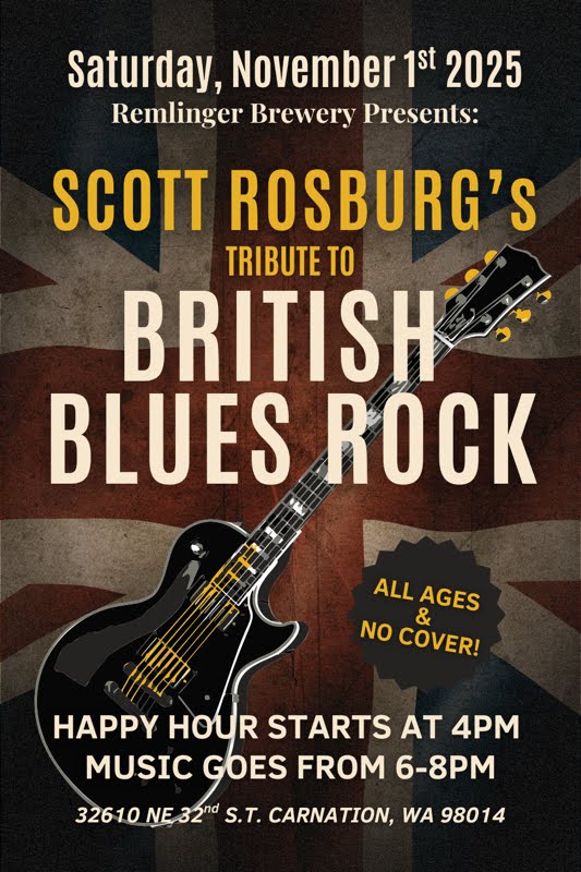 Scott Rosburg, a veteran of the Seattle music scene and one of the Northwest’s finest blues guitarists, takes the stage with his electrifying Tribute to British Blues Rock. From Clapton to Cream, Bowie to The Who, Dire Straits to The Beatles — every chord hits like a time machine to rock’s golden era.