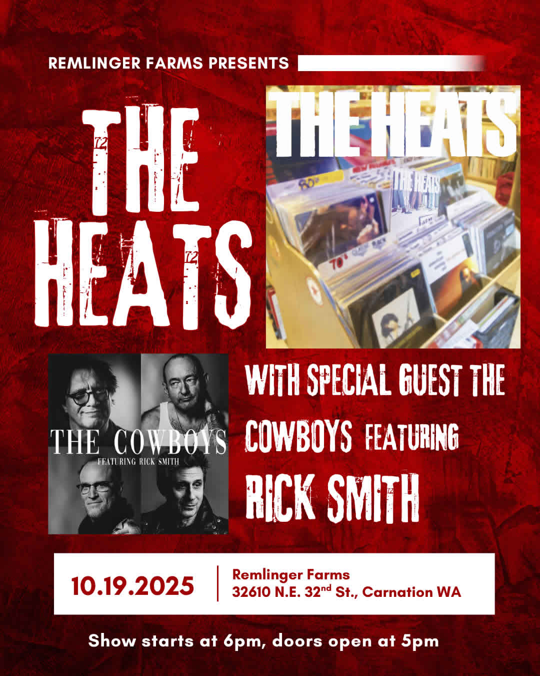 Eliciting the verve and excitement that defined Seattle’s early 1980s music scene, The Heats, who released their highly praised, sophomore album in 2024, are returning to Remlinger Brewery Oct. 19. Joining the venerable rock band are The Cowboys Featuring Rick Smith, whose lineup of popular musicians deliver a powerful revival of the Emerald City’s musical legacy.